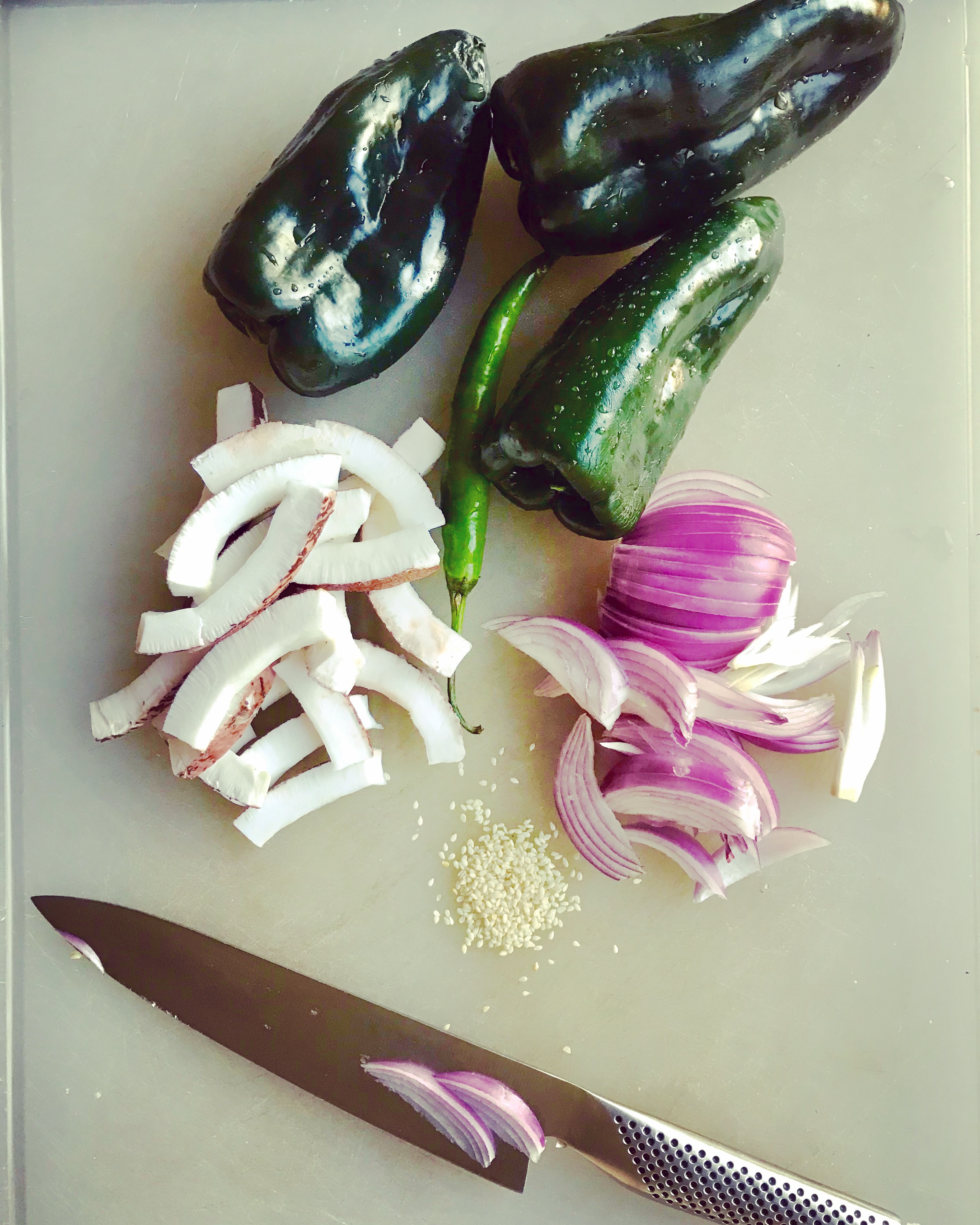 - Over an open flame, smoke the poblano peppers until the skin starts to singe. Allow to cool, then wash, deseed by slitting down the middle but make sure to leave it attached at the stem.