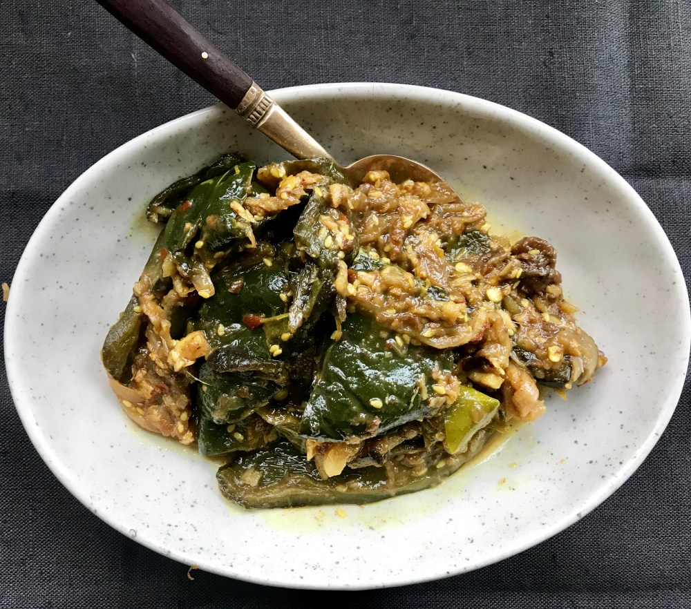 Mirchon ka salan is usually presented as a saucy curry. I have adapted it into a delicious dry version where all the ingredients stand out and can be served as an ideal side dish. Poblano peppers (the recommendation is to use peppers of medium-mild heat as to not overwhelm the palette) gave it a meatier taste and the addition of Serrano pepper increased the heat factor.