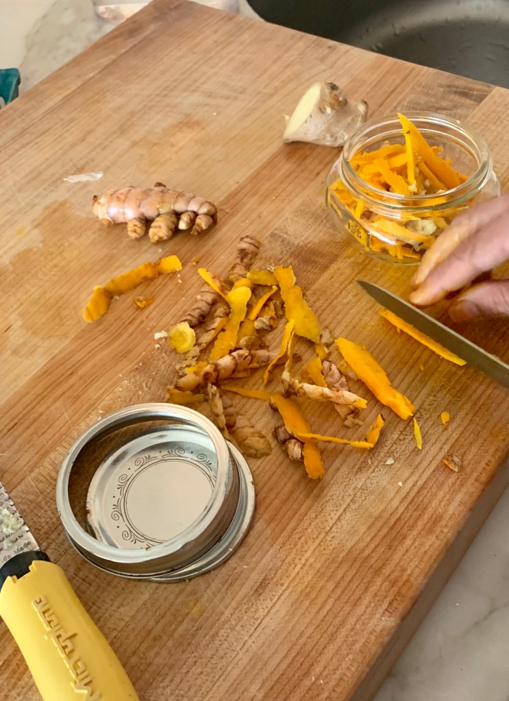 Times are strange. We are all home. Sheltering ourselves from what seems like the malignant outside. Covid-19 has put to bed the city that took pride in never sleeping. There is a pause everywhere, like we are holding our breath, waiting for the next thing to unfold. A morbid fascination to turn on the news. It seems a global cleansing is happening but at a huge human cost. Society is being forced to change to focus on what makes us human, being with loved ones, washing our hands, reducing self-indulgence through all sorts of mindless consumption, staying local. In the home, we are happy to be together yet unsettled, not quite sure what to do with ourselves. P.S. 6C or remote school is to begin next week, a routine has not set in place as yet. The fridge is stocked and the urge to cook is very strong. This is a recipe that I have thinking about for a long time. Fresh turmeric has been everywhere. It is peppery, aromatic and earthy, great when grated in soups, added to smoothies or used in curries. I want to pickle it with some ginger root, black pepper, maple syrup and apple cider vinegar. This powerhouse of antioxidants seems right (and delicious) at this time when all we can think about is our immunity!