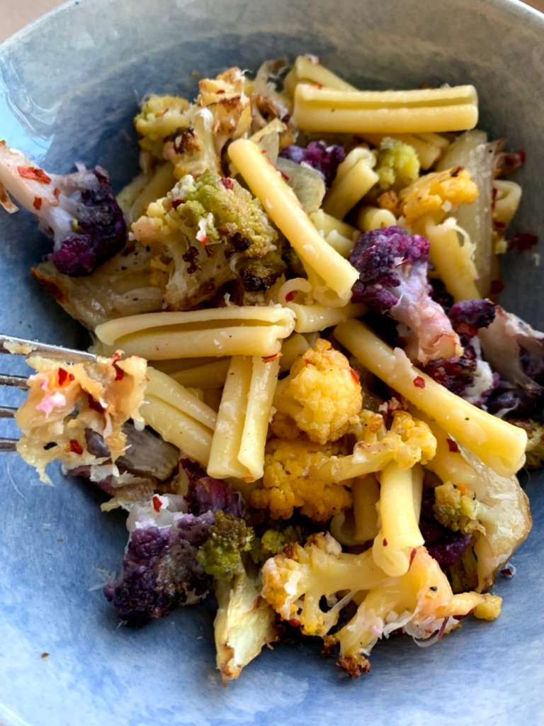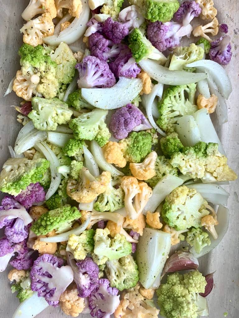 As more online grocery services now show a dwindling inventory of fresh produce and no delivery dates in the near future. While grocery stores are now likely unsafe, really one of the few places where people are still in such close proximity, some with no masks or gloves, use of kitchen ingredients is getting more creative (desperate?). The past few days i have opened the fridge or the pantry and have had absolutely no idea what to eat. It is not overflowing and the contents don’t always complement each other. There is not much that I can do about the situation other than to make the best of it. Today, I noticed a box of colorful cauliflower florets that I had ordered some time ago. The orange and purple variety are higher in antioxidants than the white variety and also look so pretty plus the a head of cauliflower was nowhere to be found in the internet produce world. Hungry and devoid of head space to think of something very involved, I added some white onions chunks and unpeeled garlic cloves and roasted them. Also, the simplest and most delicious way to cook cauliflower.