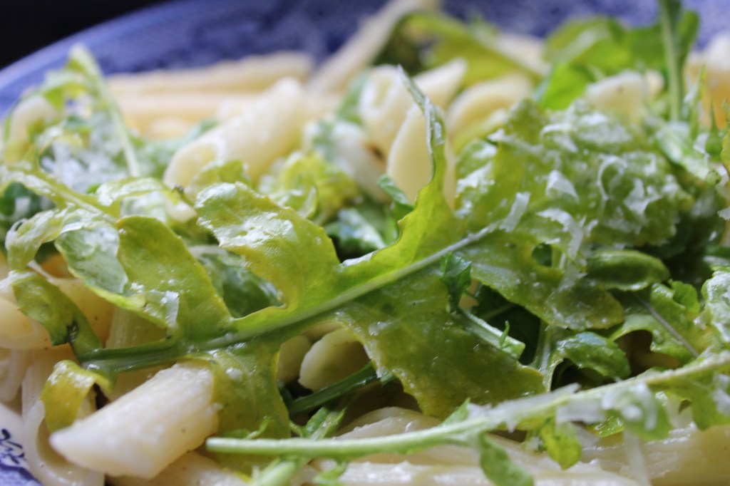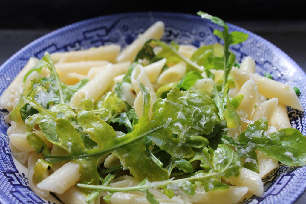 it is such a dreary day. There has been bad news in the family and I have no motivation to eat, much less cook. The gray weather outside is not bringing any cheer either. The world just seems so bleak. What a year we have had! So much can be said about that but back to food and eat I must. The most I could muster was to boil some pasta and toss it with some garlicky arugula and parmesan. It surprisingly turned out to be just what I needed.